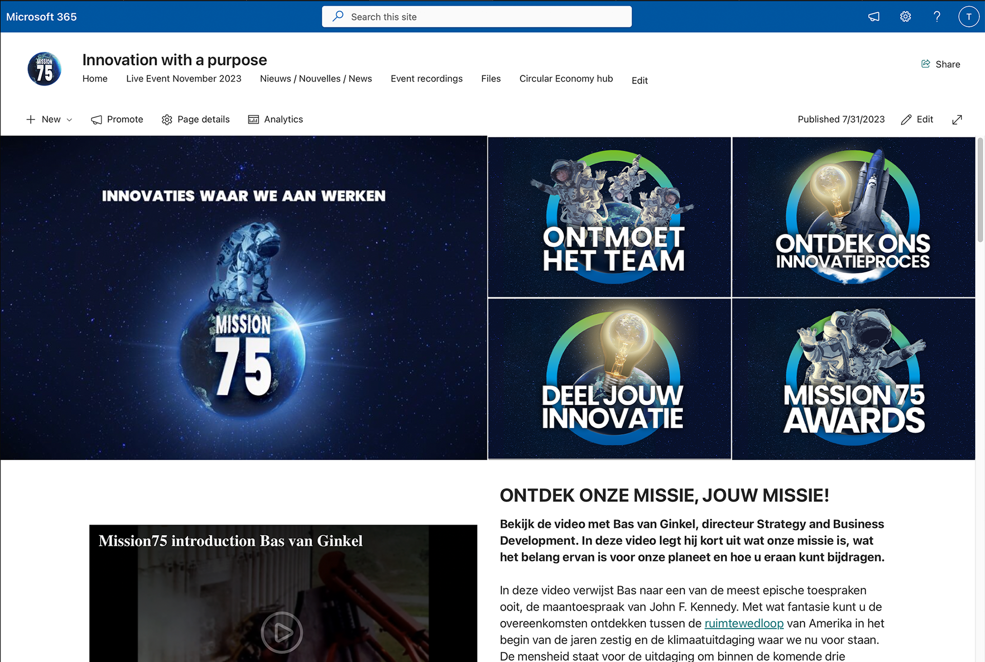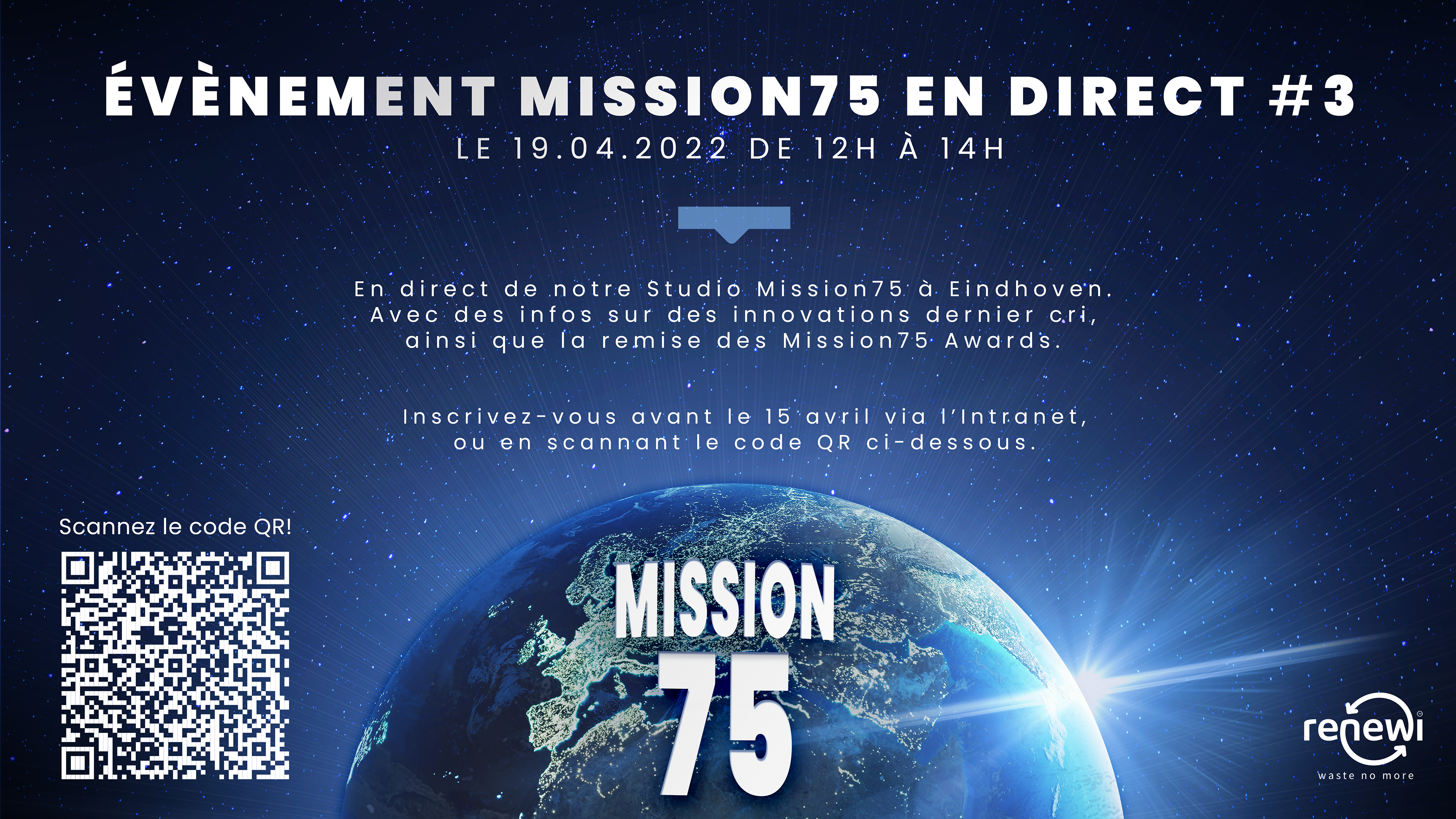 Voor de aankondiging van het Mission75 event zijn meerdere communicatieve uitingen gemaakt om de doelgroep te stimuleren om zich aan te melden, zowel in het Frans, Engels en Nederlands. Ze werden getoond op het Intranet (banner), de narrowcasters (animatie en poster) en staande banners op verschillende locaties.