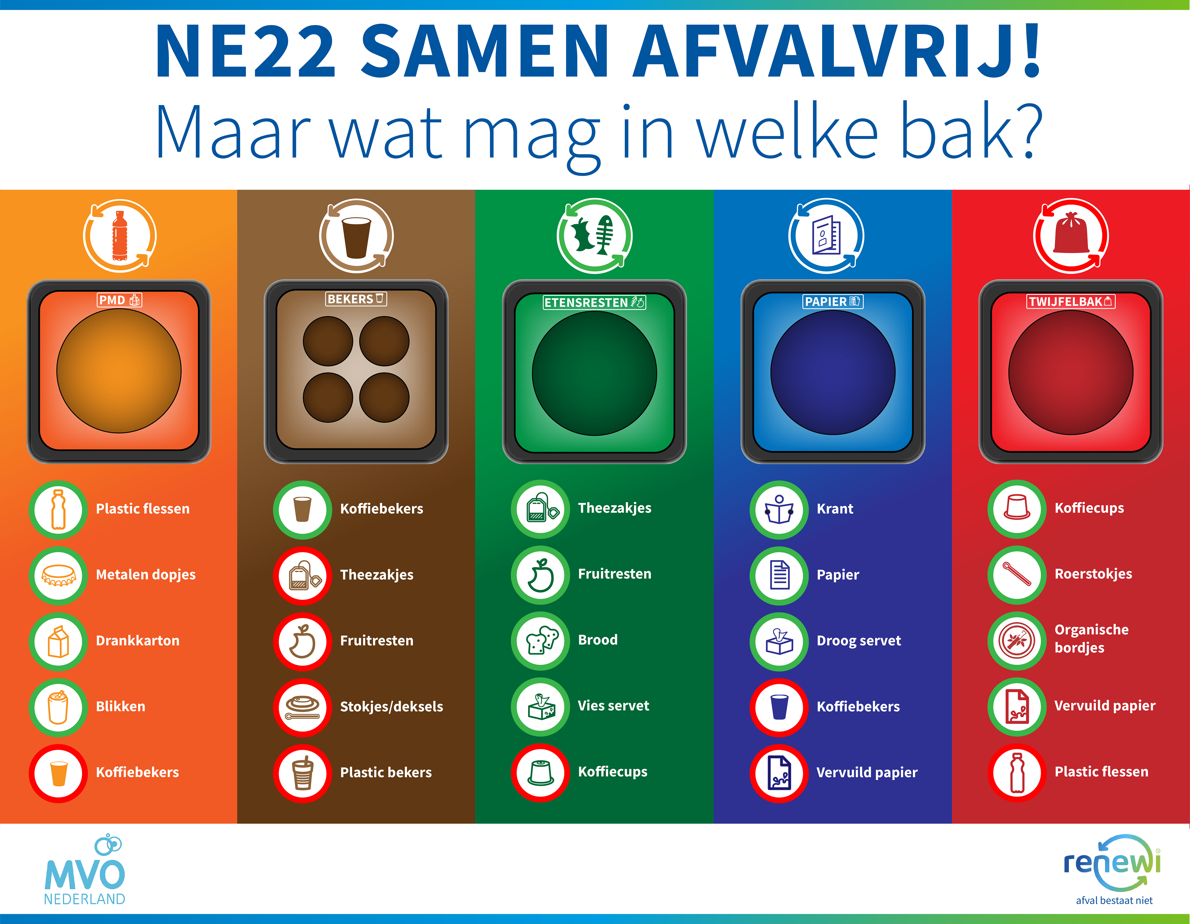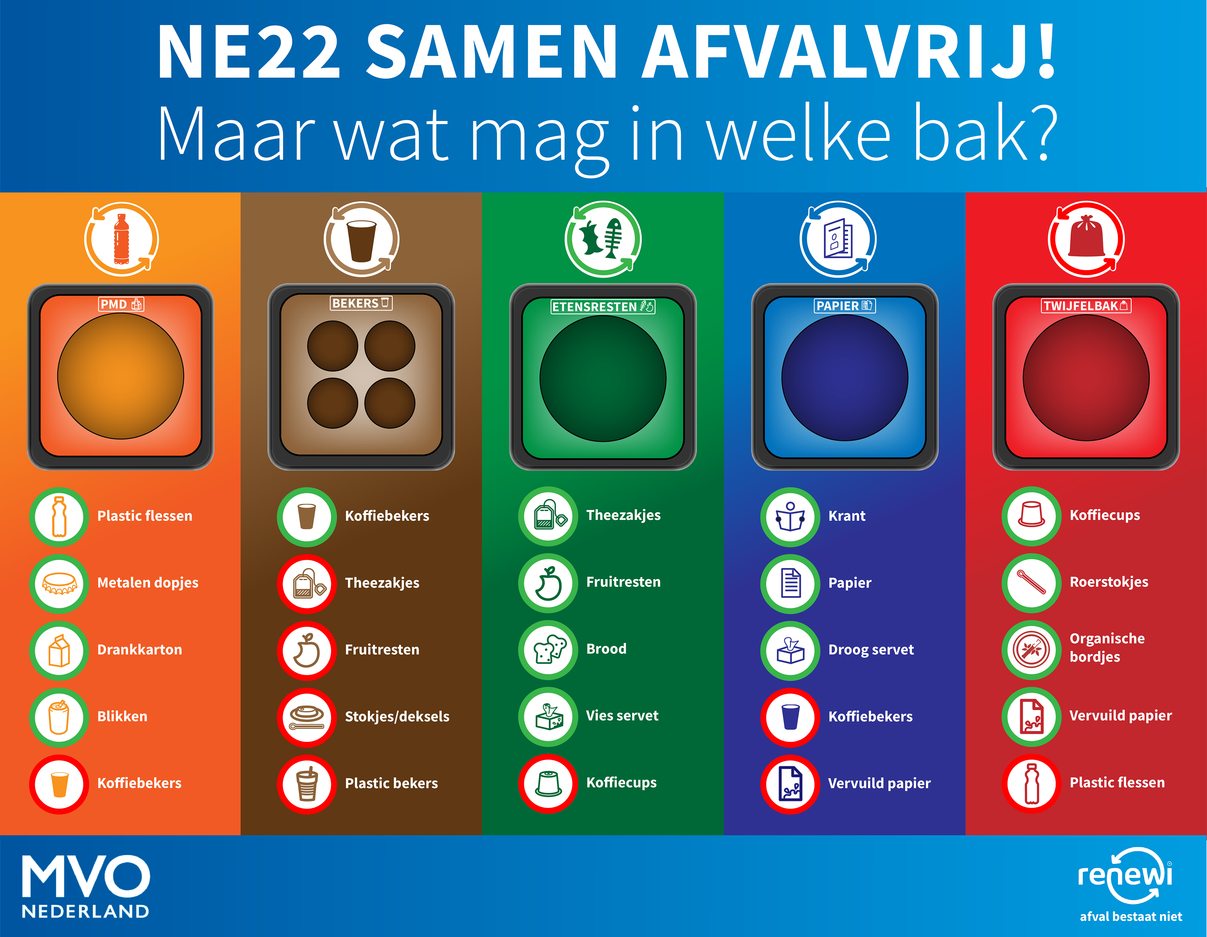Renewi was verantwoordlijk voor het afval tijdens het afvalvrije MVO NE22 event op de beurs van Berlage. Hiervoor moest het duidelijk zijn voor de bezoekers in welke container het afval hoorde. De bezoekers werden geïnformeerd via de mail en de banners op het event.
